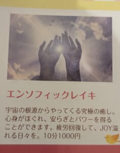 具体的には「エンソフィックレイキ・・宇宙の根源からやってくる究極の癒し。心身がほぐれ、安らぎとパワーを得ることができます。10分1000円」「トゥルータロットリーディング・・太陽神ラーの人生を後押しするパワフルな魔法。勇気とクリアな思考を取り戻します。具体的な問題解決に最適です。20分3000円、30分5000円」「チャネリング・・桜の女神コノハナサクヤヒメと繋がり、今必要なメッセージをお届けします。柔らかさと強さ、慈愛に満ちたエネルギーに満たされます。20分3500円、30分5000円」「DNAアクティベーション・・眠っているDNAを特別なクリスタルワンドによって活性化し、才能を開花します。可能性と喜びと共に生きていく究極のパワーチャージ。心身の疲れを感じている方、人間関係に違いを作りたい方、自分のパワーを発揮したい方はどうぞ。20分3500円、30分5000円」です。お問い合わせは meg33grace@gmail.com 仁瓶恵子さんまで。ぜひ体感して下さい!